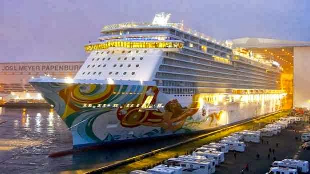 Esta es la salida del astillero Meyer Werft en Papenburg, Alemania, del barco de cruceros Norwegian Getaway, un gigante de 324m que se construye en el interior de esa mastodóntica nave industrial y que se inaugura este fin de semana en Rotterdam.